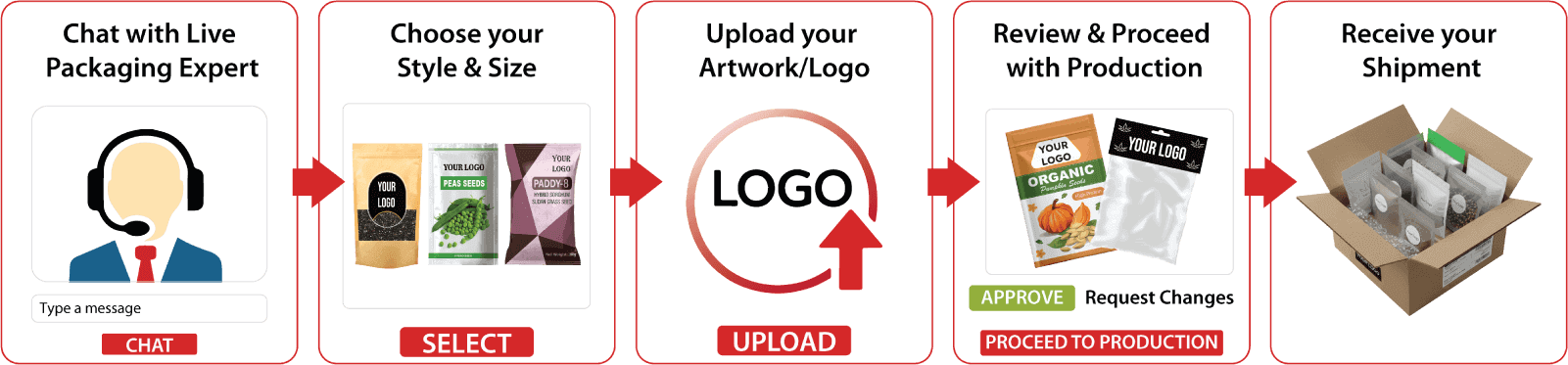 Simply chat with a packaging expert, choose your style and size, upload your logo, review the proof, and your custom seed packets will be produced and shipped directly to you.